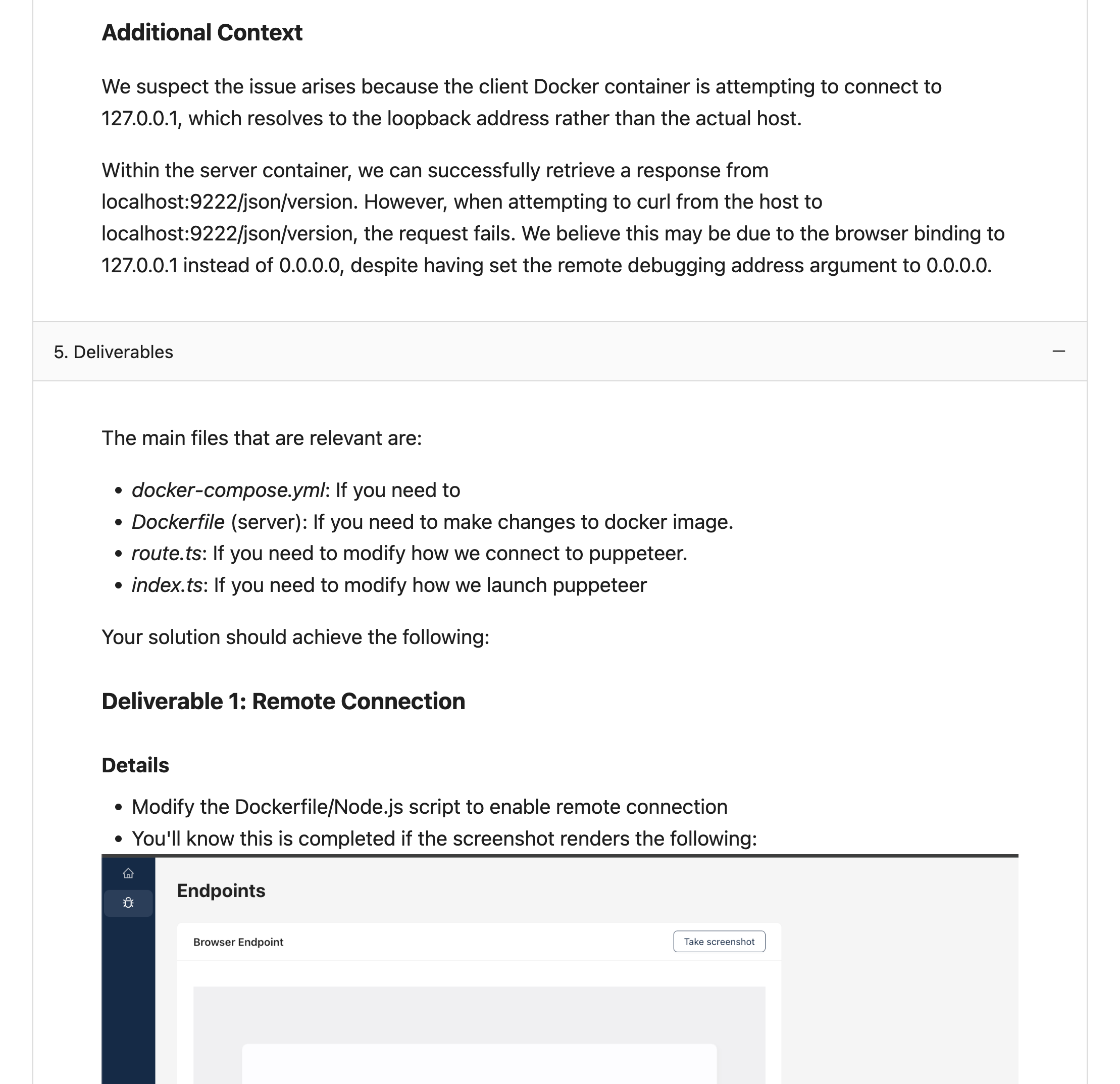 Once we had a clear specification, Scout delegated the task to its AI agent. The agent began working on the solution, exploring various approaches to handling the Chrome dependencies, security settings, and Docker configuration.